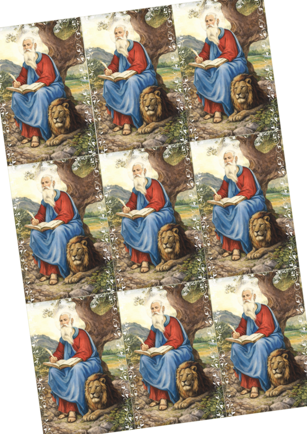 Archivo digital en formato PDF con estampitas de San Marcos de León, listas para imprimir. Cada estampita incluye la imagen en el frente y la oración en el reverso, ideal para catequesis, evangelización, parroquias o devoción personal.