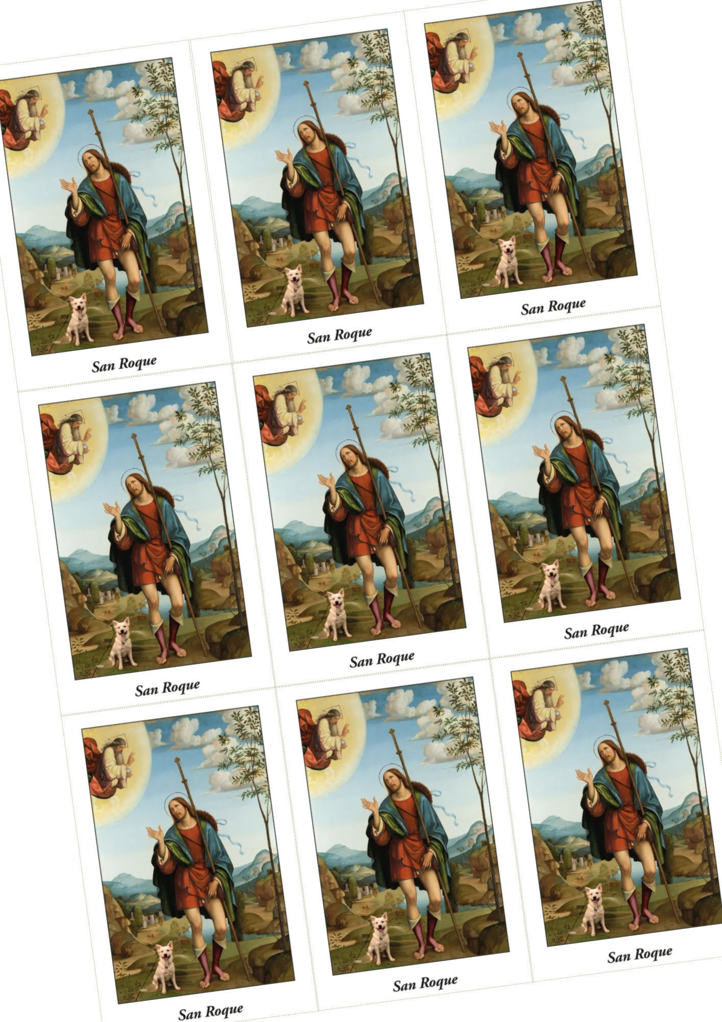 Archivo digital en formato PDF con estampitas de San Roque , listas para imprimir. Cada estampita incluye la imagen en el frente y la oración en el reverso, ideal para catequesis, evangelización, parroquias o devoción personal.
