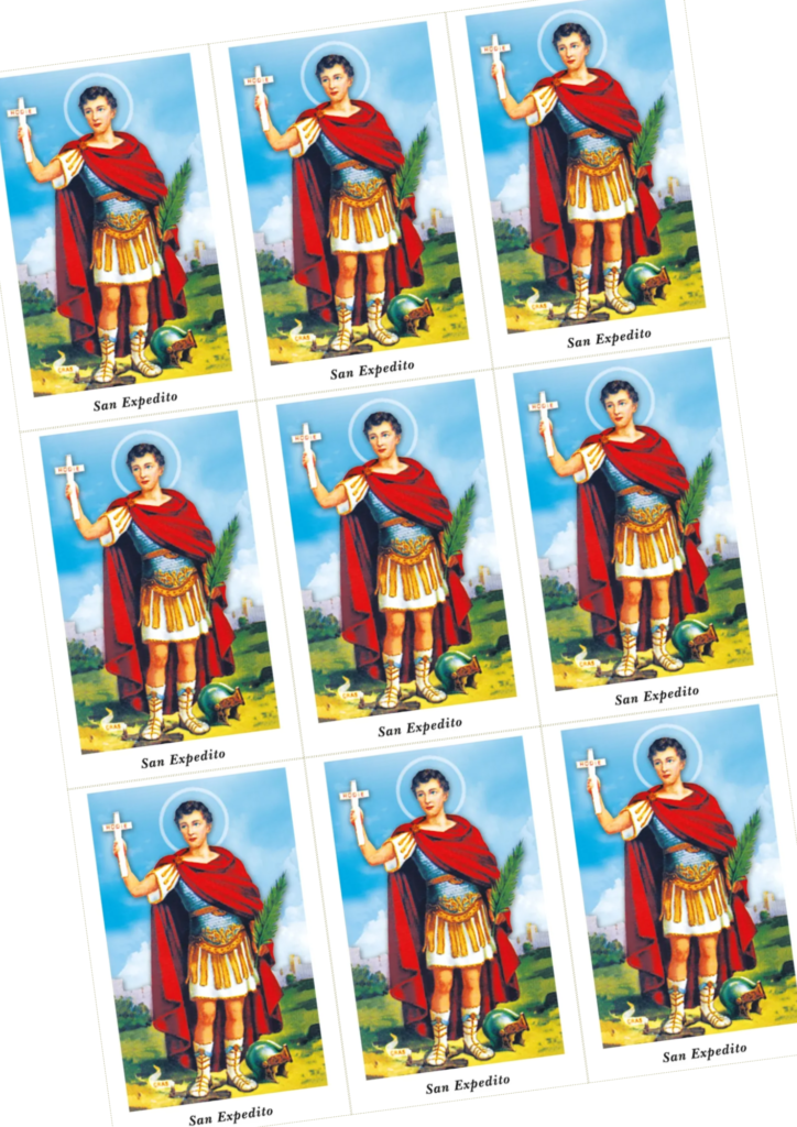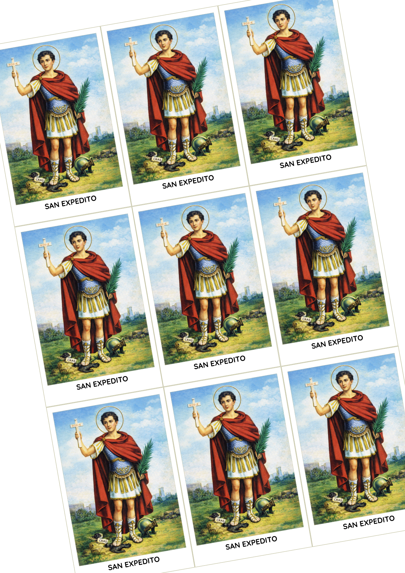 Archivo digital en formato PDF con estampitas de San Expedito, listas para imprimir. Cada estampita incluye la imagen en el frente y la oración en el reverso, ideal para catequesis, evangelización, parroquias o devoción personal.
