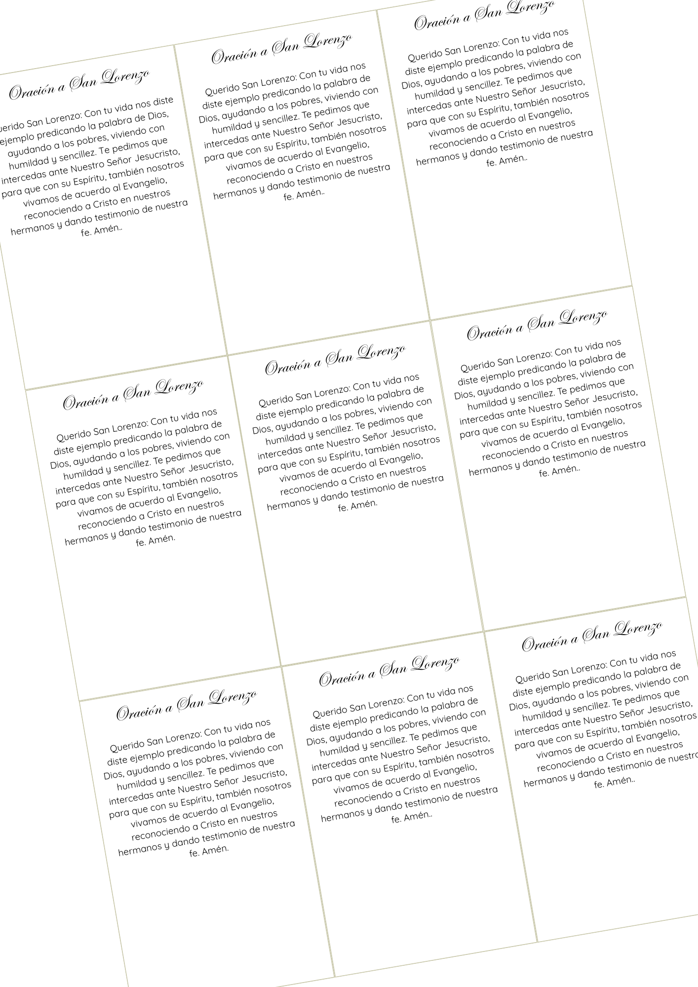 Archivo digital en formato PDF con estampitas de San Lorenzo, listas para imprimir. Cada estampita incluye la imagen en el frente y la oración en el reverso, ideal para catequesis, evangelización, parroquias o devoción personal.